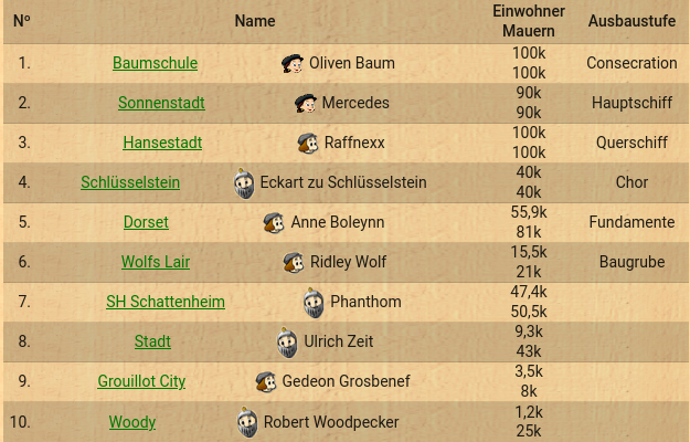 größte Stadtmauern: Baumschule (100k), Hansestadt (100k)