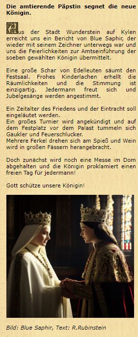 Am 09.04.2024 wurde, 90 Tage nach der Ankunft, die erste Kathedrale in Wunderstein durch ihre Heiligkeit Päpstin Violet Lilastein geweiht. Damit hat Ruby Rubinstein mit der Allianz Farbsteine den Sieg errungen.